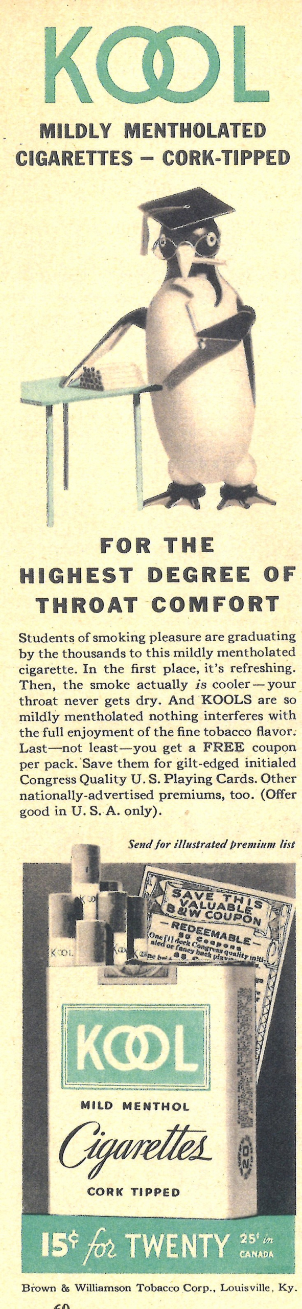 Smoking cigars and pipes was a popular pastime for college students throughout the 19th century and for much of the 20th century. “It Was My Last Cigar“ was a favorite college song of the late-1800s. This section features a copy of the first lecture delivered at an American medical school on the dangers of smoking, “On the Evil Tendency of Tobacco and the Pernicious Effects of Ardent and Vinous Spirits on Young Persons,” by Benjamin Waterhouse, MD, to the graduating class at Harvard Medical School on November 20, 1804. Dr. Waterhouse’s admonition was not heeded, as illustrated by the selection of cigar, cigarette, and smokeless advertisements aimed at college students over the ensuing 150 years. Another highlight of this section is an interview with Elizabeth Crisp Crawford, author of the definitive book on the targeting of university students by cigarette marketers, Tobacco Goes To College: Cigarette Advertising in Student Media, 1920-1980. Please also see the exhibition “Sports + Tobacco = A Losing Team” with a section (“Touchdown Tobacco”) featuring cigarette advertisements in college football programs from the combined collections of the Center for the Study of Tobacco and Society and the Paul W. Bryant Museum at the University of Alabama.
