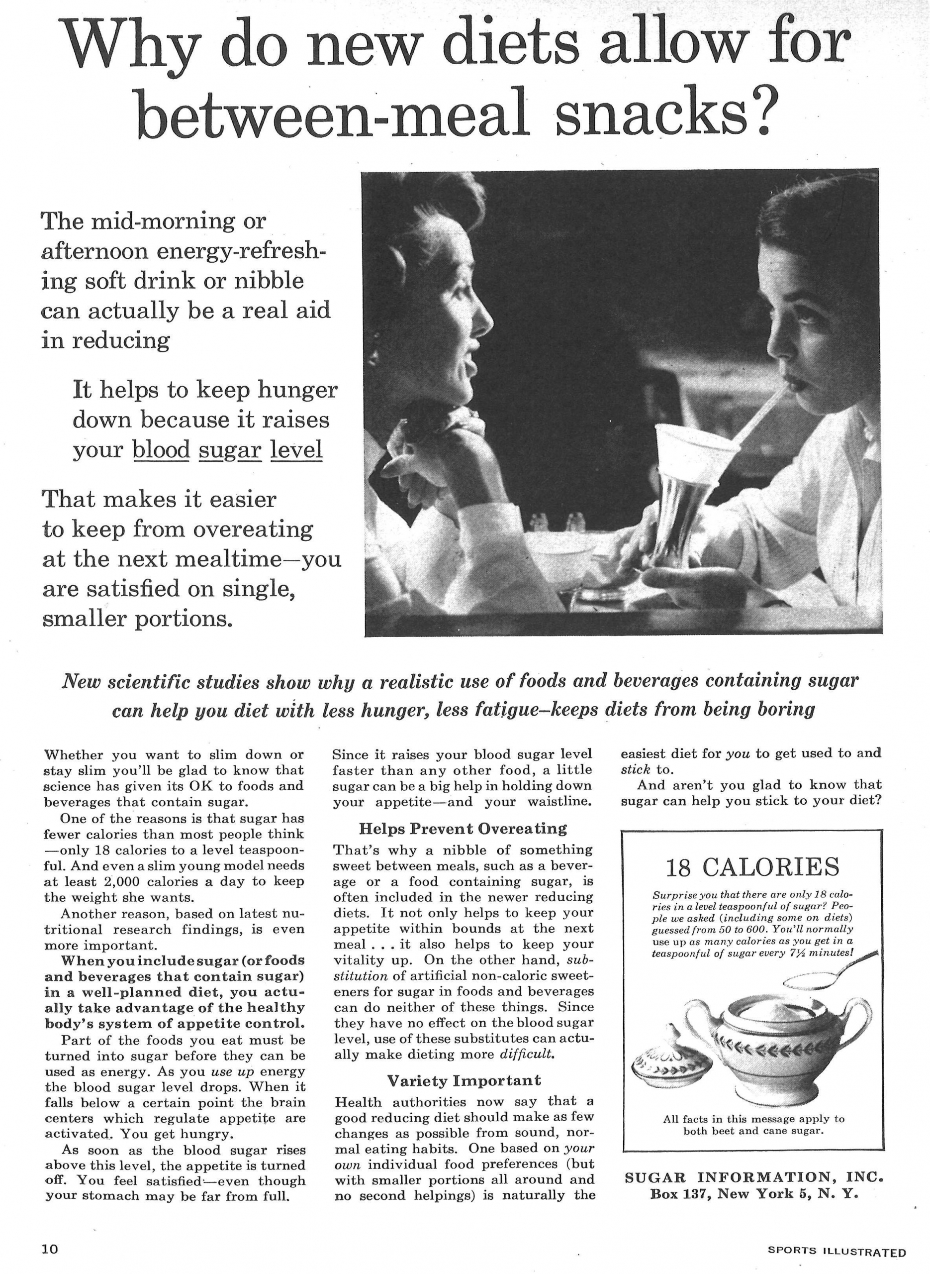 “…When you include sugar (or foods and beverages that contain sugar) in a well-planned diet, you actually take advantage of the healthy body’s system of appetite control. Part of the foods you eat must be turned· into sugar before they can be used as energy. As you use up energy the blood sugar level drops. When it falls below a certain point the brain centers which regulate appetite are activated. You get hungry. As soon as the blood sugar rises above this level, the appetite is turned off. You feel satisfied — even though your stomach may be far from full .